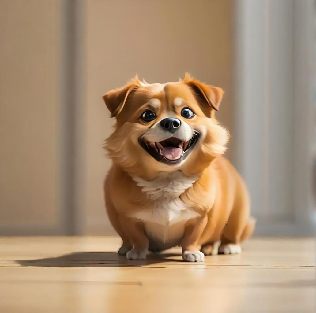 Its soft brown and white fur looks warm and charming. Its eyes are big and bright, flashing with joy, and its mouth is slightly open, revealing white teeth, as if smiling. Its erect ears and round body, combined with its short limbs, make it look particularly cute. Although the background is blurred, it highlights the agility and vitality of the dog as the main subject. Overall, this is a Tibetan hound full of joy and charm. It looks strong, but has a cute expression on its face. It is smiling at its owner and communicating.